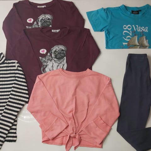 Myydään tyttöjen siisti vaatepaketti, koot välillä 140-152 cm. Sisältää: neulepaita, Filan huppari, farkut, farkkuleggarit, 2 pyjamaa, t-paita, pitkähihainen paita, leggarit, urheilupaita ja -housut.