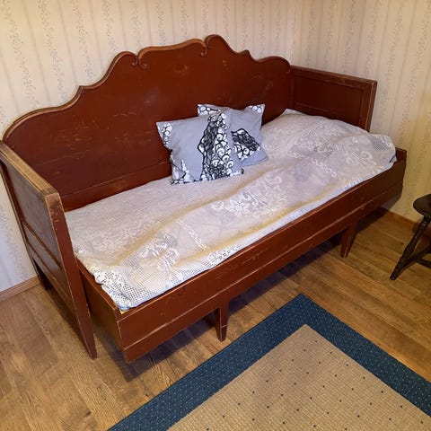 Täysin ehjä puusohva. Kannen alla säilytystilaa.