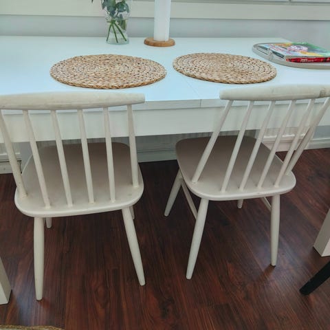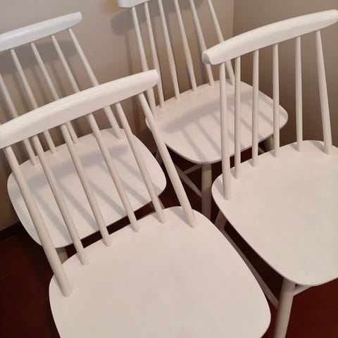 Mustaksi maalatut puiset tuolit, maalipinnassa paikoin kolhuja ja naarmuja, mutta muuten hyväkuntoiset, ehjät ja tukevat. Hp 15 e/ tuoli. Nouto ennen 28.2.