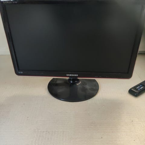 Näytön koko arviolta noin 24–32 tuumaa. Takana useita liitäntöjä (mm. HDMI, scart ja muut perusliitännät, tarkemmat tiedot laitteen tyyppikilvestä). Mukana virtajohto ja kaukosäädin kuvan mukaisesti.