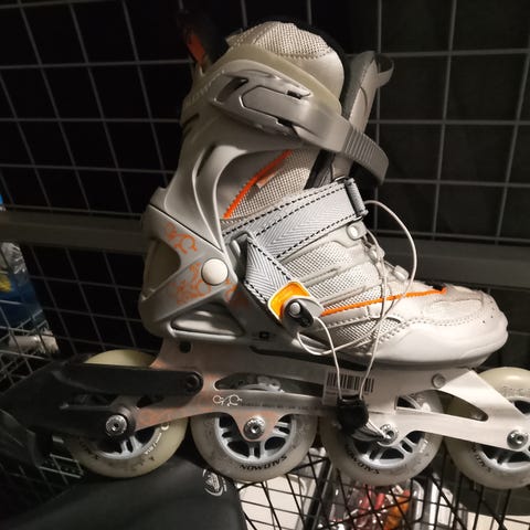 Salomon rullaluistimet, koko 36 (EU 36 1/3, UK 4, US 5,5). Neljän renkaan malli, jossa alumiininen runko ja Salomon-merkkiset renkaat. Väri pääosin harmaa ja valkoinen oransseilla yksityiskohdilla. Kiristys järjestyy soljella, tarranauhalla ja nauhoituksella. Soveltuu rullaluisteluun kovilla alustoilla. Rakenne tukee nilkkaa ja tarjoaa säädettävän istuvuuden.