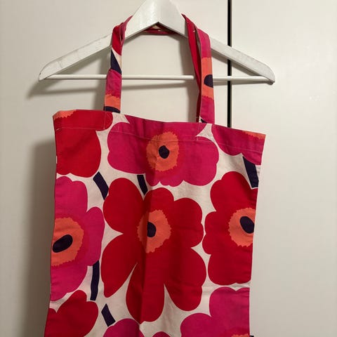 Marimekko Unikko kangaskassi. Kassi on valmistettu puuvillasta ja siinä on valkoinen pohjaväri, musta Marimekko-teksti sekä punaiset Unikko-kukat. Sopii esimerkiksi ostoskassiksi tai arjen kantokassiksi.