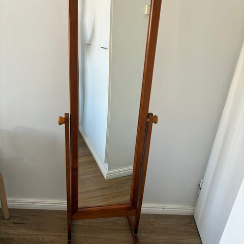 Peilin koko on 80x120cm. Kehys on tummanruskeaksi petsattua puuta (tammea?). Kehyksen leveys 7,5 cm. Peili on painava. Vain nouto Helsinki, Käpylä