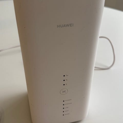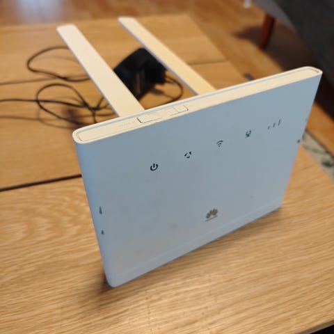 Huawei B525s-65a 4G LTE -reititin. Väri valkoinen. Laitteessa on kaksi ulkoista antennia langattoman verkon parantamiseksi. Takapaneelissa on useita Ethernet-portteja kaapeliyhteyksille sekä liitännät virtalähteelle. Reititin tukee WiFi-yhteyttä ja mobiililaajakaistaa SIM-kortilla (4G LTE). Mukana virtalähde. Toinen antenni vähän klenkku mutta saa kohdalleen