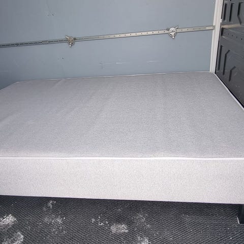 Jysk runkopatjasänky, jossa harmaa kangasverhoilu. Kangas on paksua villasekotetta. Sängyssä on puinen runko ja puiset jalat. Pohjassa on puinen sälepohja. Ovh Jyskistä n. 900€, ollut käytössä 2,5v.