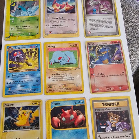 Jokunen sata pokemon kortteja aivan täysin sekalaista paljon kyllä kiiltokortteja enimmökseen ns vanhempaa ei uutta uutta mut jotain kuvia uupuu mutta könttösettinö kaikki mailmalle sielä on normikortteja ja oisko joku 10japanikorttia jostain rip shipistö ja sit toppseja charru yms fiksua settiä keräilyyn tai aloitteluun en käynyt sen koomin käpi vuosien varrelta jostakin aina tullut ei muistia sen koomin ei innosta/kiinnosta enää kortit niin joutaa jollekkin joka arvostaa
