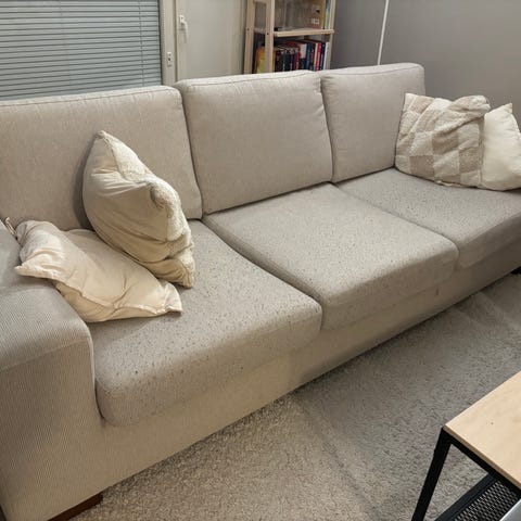 Annetaan harmaan värinen sohva. Aikoinaan Ikeasta ostettu. Jonkin verran himmeitä tahroja kankaassa ja yksi pieni kohta käsinojassa mihin piirretty kuulakärkikynällä. Voisi lähteä puhdistamalla. Yleisilme sohvassa kuitenkin siisti eikä . Ei hajuja. Ei eläimiä talossa.