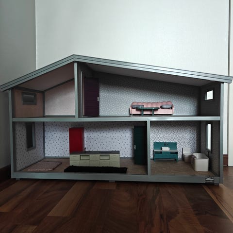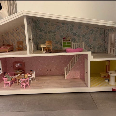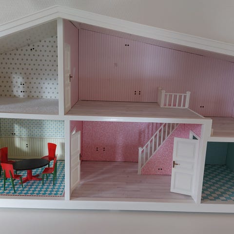 Parilla sukupolvella ollut nukkekoti yllättävän hyvässä kunnossa. Laitoin kuvan kohdasta josta lattia näköjään johon rikki en muuta vikaa äkkiseltään löytänyt.