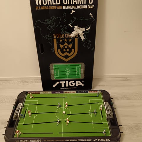 Stiga pöytäjalkapallopeli, jossa vihreä kenttä ja liukukiskoilla liikkuvat pelaajahahmot kahdessa joukkueessa. Pelissä on maalit molemmissa päissä ja irrotettava jalkapallo. Soveltuu pöydälle asetettavaksi seurapeliksi useammalle pelaajalle. Peli on mekaaninen, eikä vaadi paristoja tai sähköä.