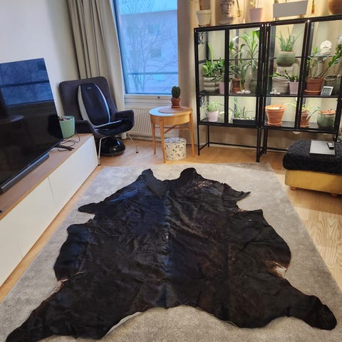 Mustavalkoinen. Karvaa irronnut paikoitellen, ollut nelisen vuotta käytössä. Eläimetön ja savuton talous.