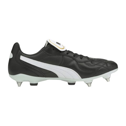 FG/AG-nappuloilla varustetut jalkapallokengät teko- ja luonnonnurmelle. Tyylikäs retrodesign, joka on saanut inspiraationsa jalkapallotähti Pelén vuoden 1970 kengistä.Puman King Top FG/AG -kengissä on erittäin mukavasta ja innovatiivisesta synteettisestä nahasta valmistettu ulkopohja. Tämä materiaali ei ole eläinperäistä.Kengissä on myös klassisempia yksityiskohtia, kuten taitettava iltti ja koristeelliset ompeleet, jotka luovat tyylikkään ilmeen. Peba-ulkopohja, jossa ikoniset FG/AG-nappulat, on suunniteltu varmistamaan hyvä pito niin teko- kuin luonnonnurmella.