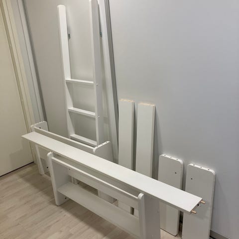 Annetaan muuton alta nopeimmalle noutajalle kunnostettavaksi. Alempi kaide vaatii vähän kauniimpaa korjailua mutta tukeva ollut näinkin. Liukumäki siisti kuvassa vaan varastossa. Meille jo käytettynä tullut. Tarrojen poisto yms jaa noutajalle. Patjakoko n 90×190 patjaa ei mukana.