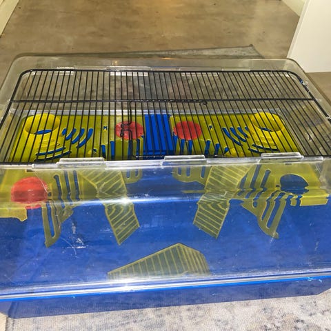 Pieneläimen tarvikkeet, joihin kuuluu muovinen häkki tai asumus, kuljetuslaatikko, muovinen pohjalaatikko sekä erilaisia lisätarvikkeita. Kuvissa näkyy muun muassa puinen maja, juoksupyörä, ruokakuppi, silta ja muita pieneläimelle sopivia varusteita. Sopii esimerkiksi hamsterille, gerbiilille tai muulle pienelle jyrsijälle. Kaikki osat myydään yhdessä kokonaisuutena kuvien mukaisesti.