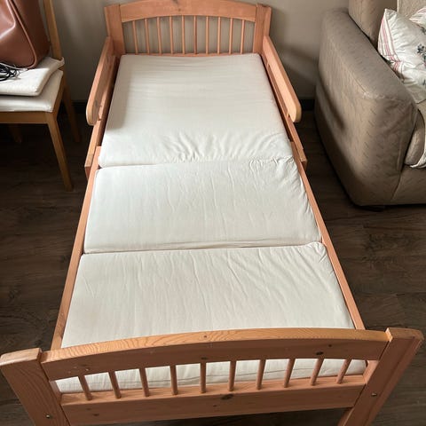 Puinen jatkettava lastensänky, jossa on vaaleanpunaiset päädyt ja valkoiset laidat. Toisessa päädyssä on kohokuvioitu hippohahmo. Sängyn alla on erillinen vetolaatikko, jota voi käyttää säilytystilana. Vähän kulumaa laidoissa (kuvat) ja tarran jämät (saanee pois).