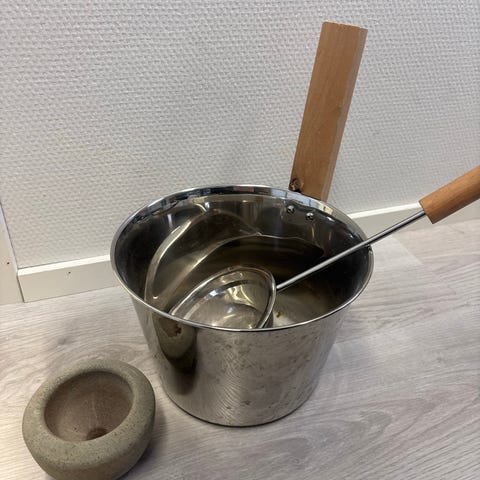 Puinen saunakiulu ja kauha. Settiin kuuluu isompi puinen saunakiulu köysikahvalla sekä pienempi puinen kiulu ja kauha. Materiaalina on lakattu tai käsitelty puu, sisäosassa tumma muovinen tai metallinen sisus suojaamassa puuta vedeltä. Soveltuu veden säilyttämiseen ja heittämiseen saunassa.