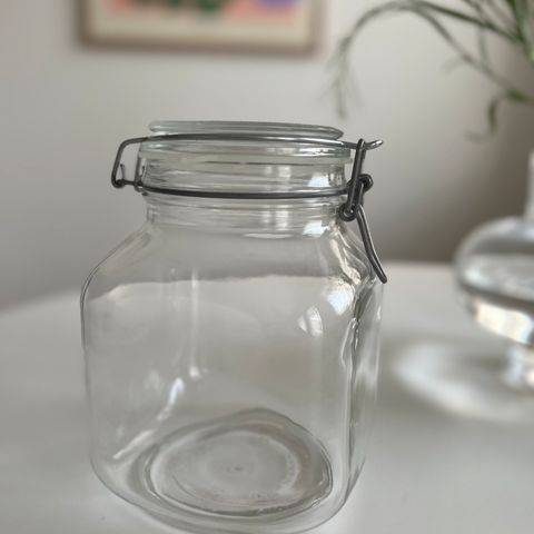 Jämäkkä kolmen litran vetoinen lasipurkki kannella ja sulkumekanismilla. Täysin ehjä.