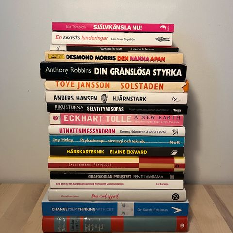 Englanninkieliset henkinen kasvu ja itsensä kehittäminen pokkarikirjat, yhteensä 6 kappaletta. Kirjojen teemat liittyvät mm. tunneälyyn, elämänhallintaan, henkiseen kasvuun ja tehokkuuteen. Kaikki kirjat ovat pehmeäkantisia (pokkareita) ja teksti on englanniksi. Sopivat luettavaksi esimerkiksi henkilökohtaisen kehittymisen, johtajuuden ja elämänfilosofian aiheista kiinnostuneille. Kuvista näkyvät kannet, takakannet ja esimerkkisivut taitosta ja tekstin koosta.