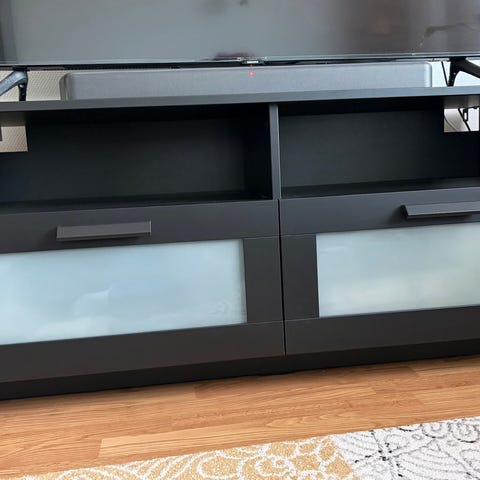 Ikean tv-taso jossa metallinen runko. Kolmitasoinen; kaksi puutasoa ja keskellä lasitaso. Pieniä käytön jälkiä.