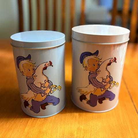 Koko 20,5cm x 18cm. Toisen purkin kannessa ruskea jälki, joka on ajan kanssa tummunutta liima.