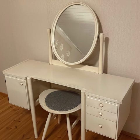 Vanhanajan kampauspöytä 1920-30-luvulta. Lev. 120 cm, syv. 42 cm, kork. peilin yläreunasta lattiaan 176 cm.