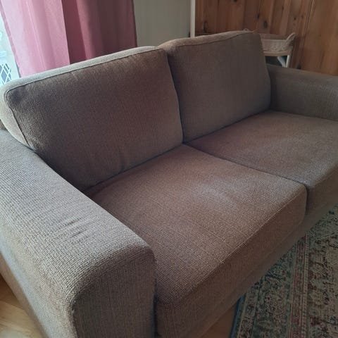 Halvalla (60€) lähtisi hyväkuntoinen kangassohva. Kolmenistuttava. Hakija huolehtii kuljetuksesta pois.