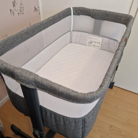 Äitiyslaatikosta tuunattu sänky patjalla ja puisella kehikolla. Idea oli saada pieni vauva nukkumaan samaan tasoon ja kiinni vanhempien kanssa samaan sänkyyn. Laatikkoon olen ommellut irroitettavat kankaat. Rakenne on jämäkkä. Mukaan settiin tukee laadukas pussilakanasetti.