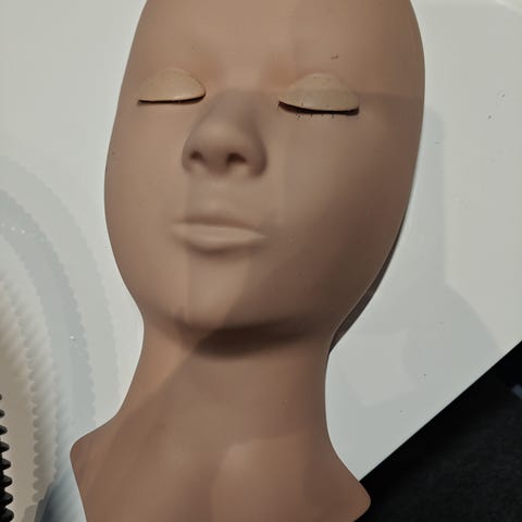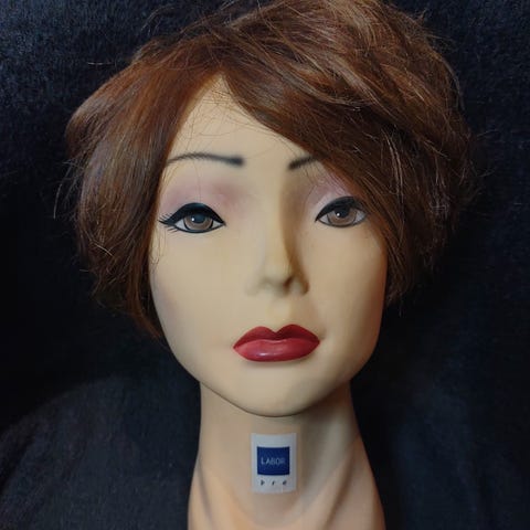 Vain kampauksiin käytetty harjoituspää. Ei ole värjätty. Latvan on leikattu tasaiseksi.