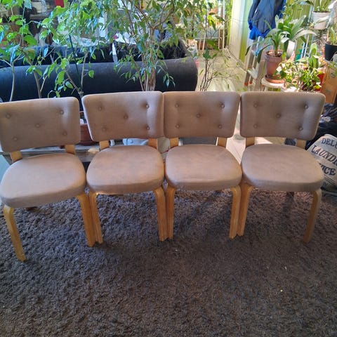 Hyväkuntoinen Artekin 90A koivuinen pyöreä ruokapöytä ja 4 kpl Artekin 66 koivutuolia. Kaikki hyvässä kunnossa, ei ole naarmuja pöydänkään pinnassa.