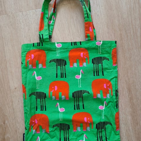 Marimekon kankaasta ommeltu kassi päiväkotiin / kirjastoon lapsen tavaroiden kuljetukseen. Kuva haalistaa värin