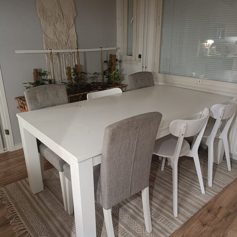 Suhteellisen hyväkuntoinen 4-hengen ruokailuryhmä. Pöytä jatkettava 120- 170cm. Todella tukeva ja painavakin, lienee täyttä puuta. Pöydän pinta nähny vähän elämää. Tuolit ei nitku eikä natku. Tukeva setti. Kotimaista tekoa.