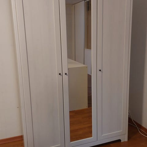 Ikean Tyssedal-vaatekaappi. Kaapissa säilytetty pääosin vaatteita.