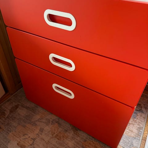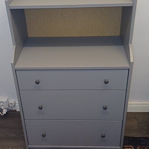 Ikea kolmilaatikkoinen Platsa-lipasto. Muuten erittäin hyvässä kunnossa, mutta yhden laatikon kulmassa on kulumaa.