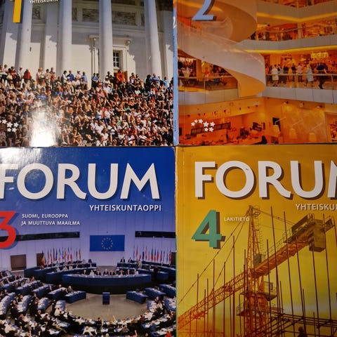 Lukion Forum yhteiskuntaoppi oppikirjasarja (LOPS-21) 1–4. Sarjaan kuuluu neljä kirjaa, jotka käsittelevät yhteiskuntaopin aiheita. Kirjat ovat siistit, mutta niissä on alleviivauksia.