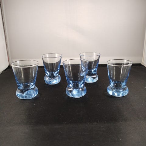 6 snapsi- tai liköörilasia, eri värejä, yksi tinaa. yhteishinta.