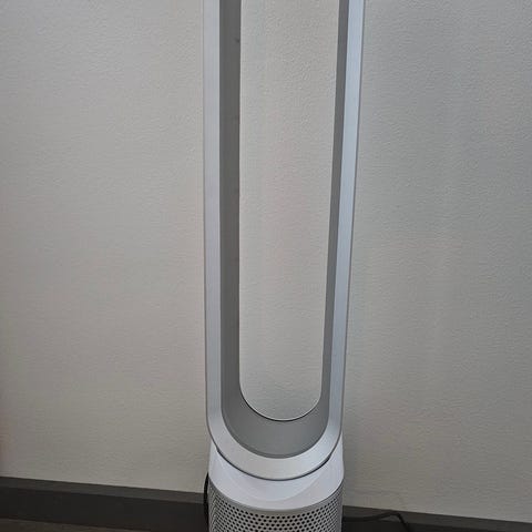 Dyson ilmanpuhdistava tornituuletin valkoisen ja harmaan sävyissä. Laitteessa on rengasmainen, lapaton puhallinosa ja sylinterimäinen alaosa, jossa on ilmanpuhdistukseen tarkoitettu suodatinosa. Soveltuu huoneilman kierrättämiseen ja suodattamiseen sisätiloissa. Virtajohto kytketään tavalliseen pistorasiaan. Tarkemmat tekniset tiedot, kuten malli, teho ja suodattimen tyyppi, löytyvät laitteen pohjassa olevasta tyyppikilvestä tai valmistajan ohjeista.