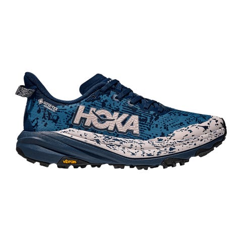 Mukavat maastojuoksukengät, joissa Gore-Tex-kalvo. Välipohja tarjoaa hyvän vakauden ja mukavan vaimennuksen. Pitävä ulkopohja. Droppi: 5 mm. Paino: 327 g.Hokan Speedgoat 6 Gore-Tex -kengissä on Gore-Tex Invisible Fit Membran. Tämä tarkoittaa, että kengän kalvo auttaa pitämään jalat kuivina mukavuudesta tinkimättä.Kengän päällinen on hengittävää Dynamic Sandwich Mesh -verkkoa, joka takaa parhaan mukavuuden. Jalkapöytä on vahvistettu kengän sisäpuolella olevilla nauhoilla, jotta jalka pysyy paikallaan.Varpaita ympäröivä suoja on vähemmän jäykkä kuin aiemmissa Speedgoat-malleissa ja takaa paremman liikkuvuuden ja mukavuuden. Välipohja on Compress Molded EVA -vaahtoa, joka tarjoaa erinomaisen vaimennuksen. Kengän ulkopohja on päällystetty Vibram® Megagrip -kumilla, jossa on pienet 5 mm:n pituiset nastat. Ne on sijoitettu ja muotoiltu strategisesti varmistamaan hyvä pito sekä ylä- että alamäessä epätasaisessa maastossa.
