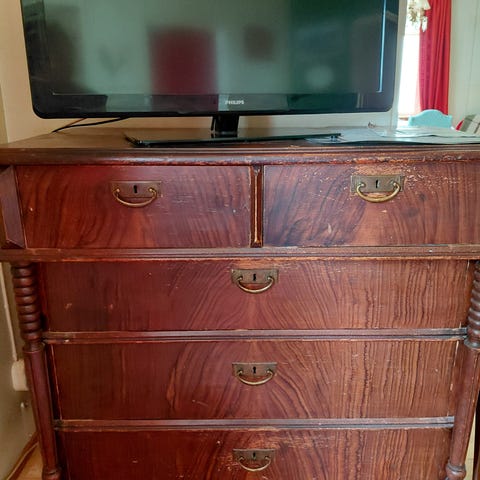L 159cm, S 48 cm, K 86 cm. Tassujaloilla, kahdella avaimella varustettu vanha antiikki senkki. Nouto maanantai iltaan mennessä.