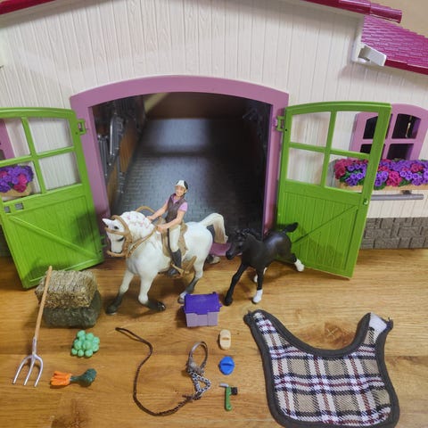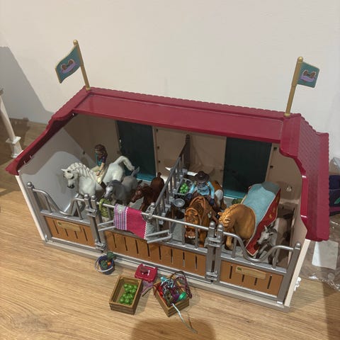 Schleich leikkitalli hevostila. Muovinen kaksikerroksinen rakennus, jossa on avattava katto ja useita huoneita sisäleikkeihin. Talli sisältää sisätiloja, parvekkeen ja ulkotarhan, jotka soveltuvat hevosten ja hahmojen kanssa leikkimiseen. Yhteensopiva Schleich-hevos- ja eläinhahmojen kanssa. Mukaan kuvaan kaikki kuvassa olevat hevoset, henkilöt ja esineet.
