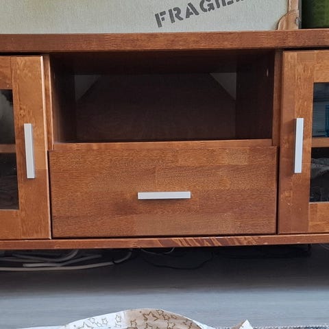 Hyväkuntoinen puinen kulma tv-taso. Lasiovet. Takaseinään leikattu kolot johtoja varten. Siisti ja ehjä, sisällä muutama naarmu, jotka näkyvät kuvissa. Leveys leveimmältä kohdalta 107cm ja kapeimmalta 30cm.