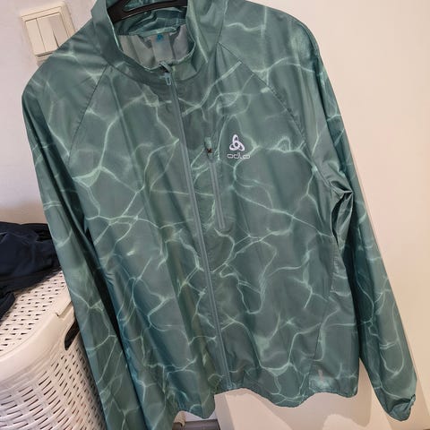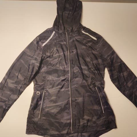 Niken ohut juoksutakki, vetoketjutaskut edessä, kiristysnyöri helmassa, yläselässä verkkoneulosta tuulettumiseen.
