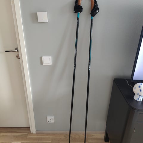 Kahden lapsen käyttämät Peltonen Nanogrip Facile-maastohiihtosukset 167cm ja One Way Diamond Storm jr hiihtosauvat 120cm.