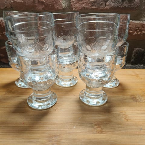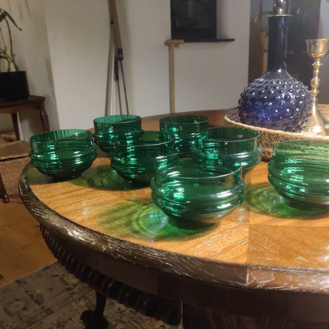 Riihimäen lasin sulttaani pikarit väriltään vihreä suunnittelija Nanny still. Pikarit virheettömiä ja kolmessa vielä Riihimäen lasin tarra tallessa. Pikareiden korkeus 14 cm.