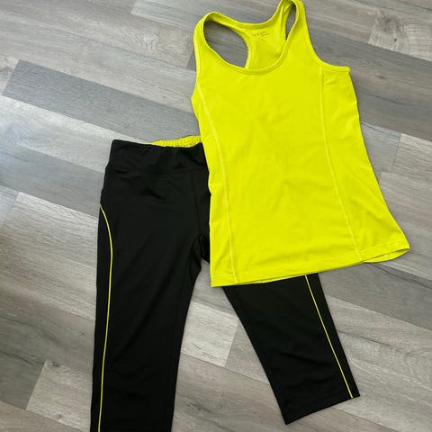 Paidassa edessä iso lenkkitasku, johon saa vaikka puhelimenkin mahtumaan. Samoin housuissa kaksi vetoketjullista taskua kirkkaan keltaisilla koristenauhoilla.