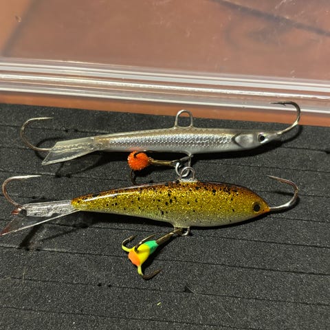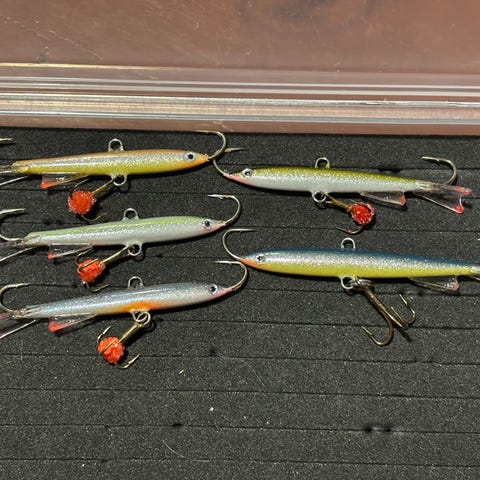 Kuusamon 5cm tasapainopilkit. Joku näistä saattaa olla kokeiltu, mutta kaikin puolin ehjät, koukut terävät. Rasia ei kuulu kauppaan.