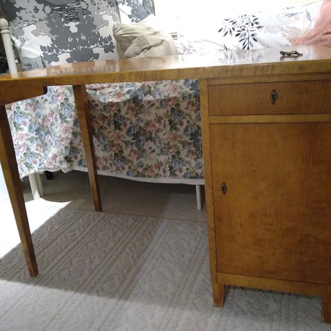 Vähälle käytölle jäänyt siro, vanha täyspuinen työpöytä laatikostolla kaupan. Edellinen omistaja maalannut vaalean mintunvihreäksi. Ei eläimiä taloudessa. Nouto Sompasaaresta.