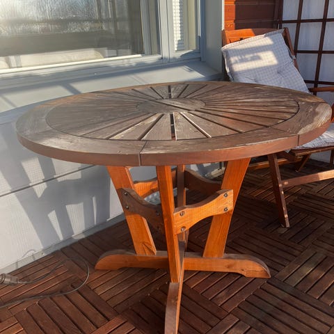 Pyöreä parvekepöytä ja kaksi tuolia. Pöydässä on harmaa, laudoitusta muistuttava kansi. Tuoleissa on metallirunko ja verkkokankaiset istuinosat ja selkänojat. Sopii esimerkiksi parvekkeelle tai terassille ulkokalusteryhmäksi.
