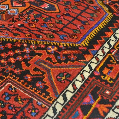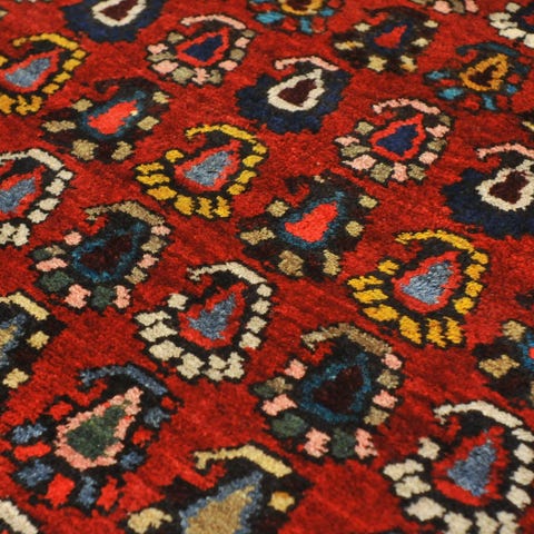 Erityistä: Korkealaatuinen villa, jossa eri villaeristä johtuvaa sävyn vaihtelua (”abrasch”). Bijarin matoille tyypillinen jäykkä loimi, mikä tekee matosta jämäkästi lattiaa vasten asettuvan. Semiantiikkinen matto 1900-luvun puolivälin tienoilta.