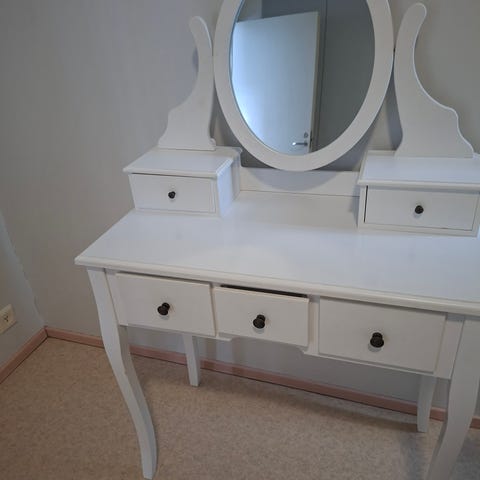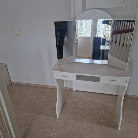 Pöydän tason korkeus 76cm, korkeus peilin ylälaidasta 130cm, pöydän syvyys 40cm ja leveys 80cm.