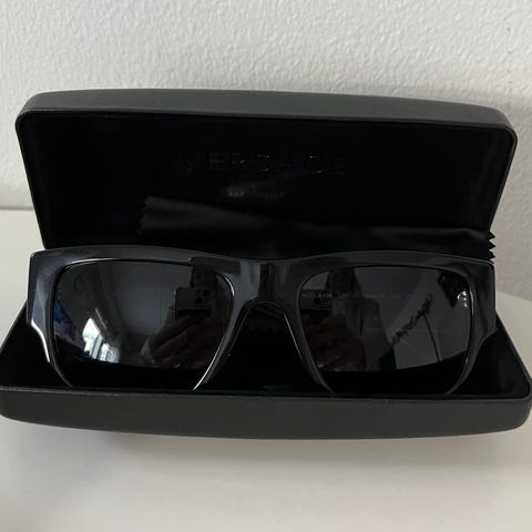 Versace Medusa 2228 unisex-aurinkolasit metallisilla kehyksillä. Kehysten väri on kullanhohtoinen ja linsseissä on tumma sävy. Sangan sivuissa on avoin rakenne ja pyöreä Versace Medusa -logo. Sangan sisäpuolella merkinnät: Mod. 2228, koko 60□15, pituus 140 mm. Valmistusmaa Italia. Mukana Versace-kova kotelo ja puhdistusliina, joissa molemmissa Versace-logo.