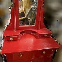 Vanhanaikainen lipasto peilillä. Toinen sivu naarmuuntunut ja takana yksi reikä. Peili on ehjä ja sisällä oleva valo toimii.